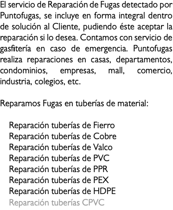 El servicio de Reparación de Fugas detectado por Puntofugas, se incluye en forma integral dentro de solución al Cliente, pudiendo éste aceptar la reparación si lo desea. Contamos con servicio de gasfitería en caso de emergencia. Puntofugas realiza reparaciones en casas, departamentos, condominios, empresas, mall, comercio, industria, colegios, etc. Reparamos Fugas en tuberías de material: Reparación tuberías de Fierro Reparación tuberías de Cobre Reparación tuberías de Valco Reparación tuberías de PVC Reparación tuberías de PPR Reparación tuberías de PEX Reparación tuberías de HDPE Reparación tuberías CPVC